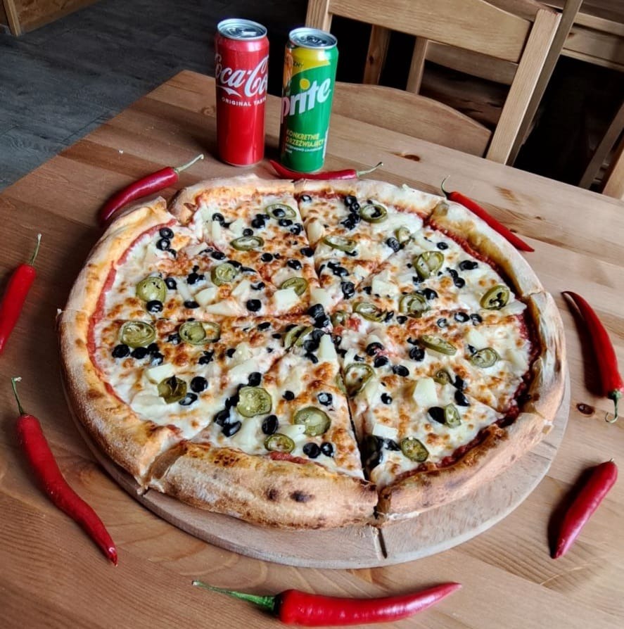 sos pomidorowy, ser mozzarella, salami łagodne, boczek, jalapeno -