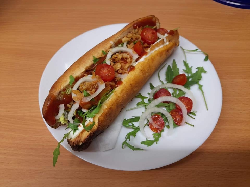sos remulada, ser pomidor, kiełbasa, cebula, ogórek konserwowy -
